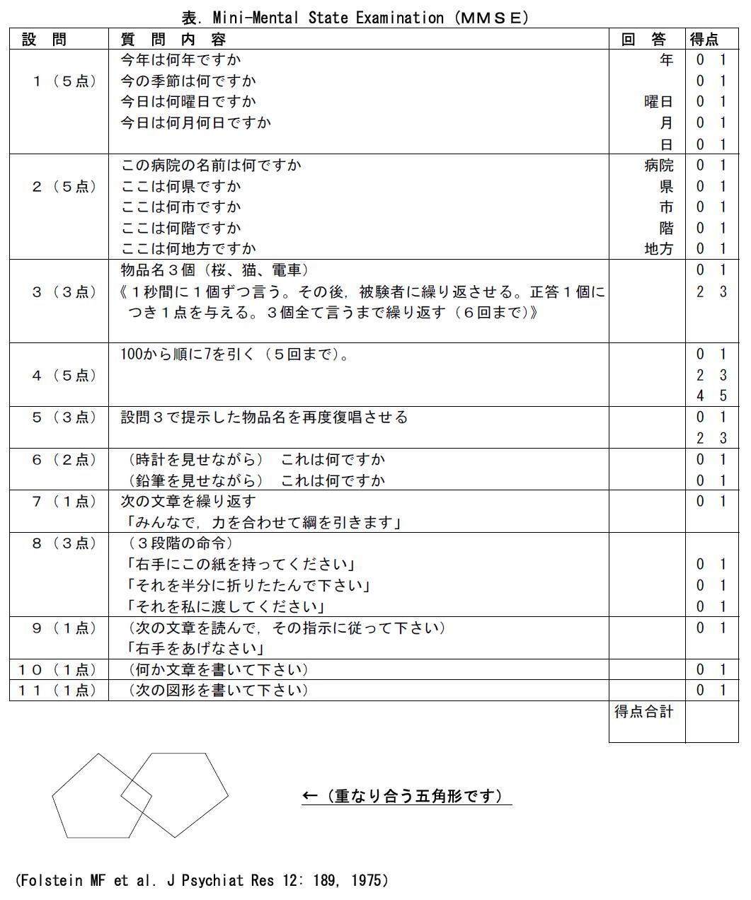 ・MMSE…MMSEとは、Mini Mental State Examination(ミニメンタルステート検査)の略で、認知症の疑いのある人をスクリーニングするための知能検査です。