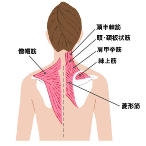 これらの筋肉は、頭から肩甲骨周囲まで伸びているため、首と肩の両方に関与します。